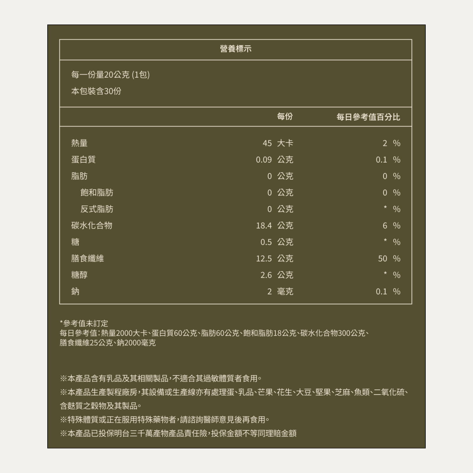 - 1 包 20g,膳食纖維達 12.5g(達衛福部建議每日攝取量的 50%)。