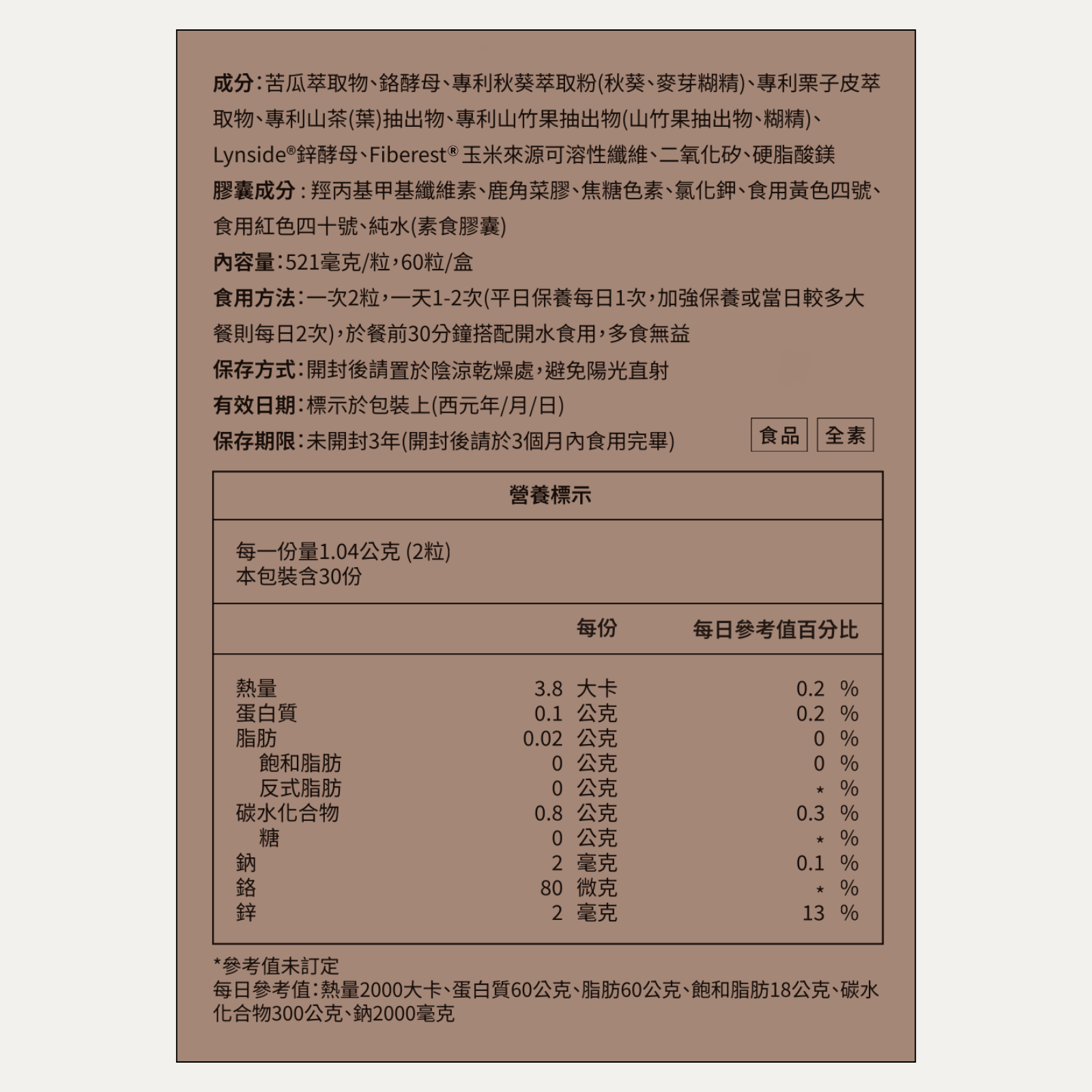 - 酵母鋅 + 酵母鉻:選用百年大廠酵母發酵技術,生物利用率高。鋅與鉻有助於維持醣類正常代謝。