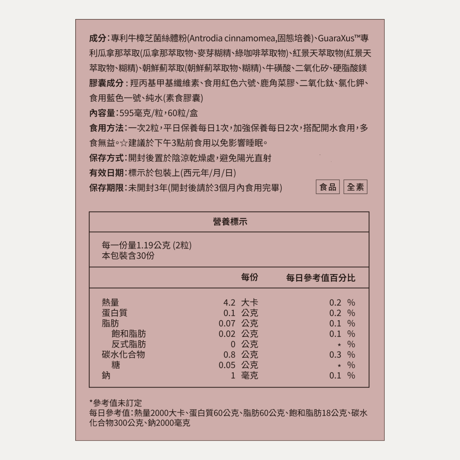 - 內容物皆為植物來源,採用純素膠囊,素食者可安心食用。
